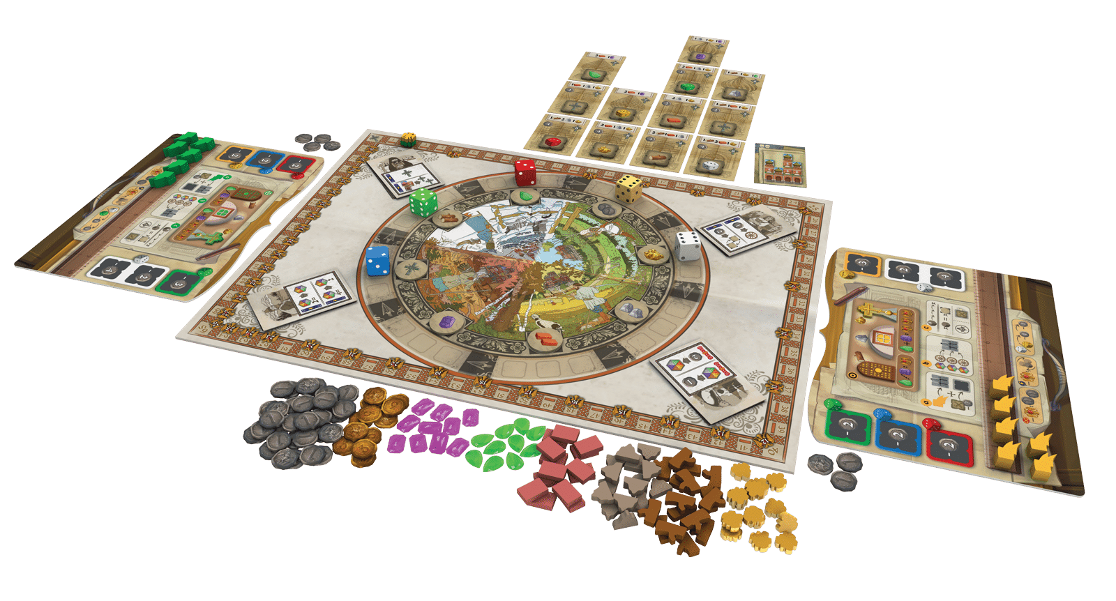 Chaque action découle souvent sur plusieurs effets complémentaires, mais l’ensemble des parties demeure fluide et intense, procurant des belles sensations de développement et d’accomplissement. La mécanique d’attribution des ressources, particulièrement innovante, s’effectue sur un plateau circulaire sur lequel naviguent des dés. La face des dés indique le nombre de cases qu’ils peuvent franchir, et donc à quelles ressources les joueurs auront accès lors de leur tour de jeu. Les joueurs doivent peser leur choix, car leurs capacités en stockage sont limitées. L’ordre dans lequel les actions sont menées sera donc souvent déterminant, ce qui induit pas mal de réflexion sur les nombreuses possibilités stratégiques que procure le jeu.