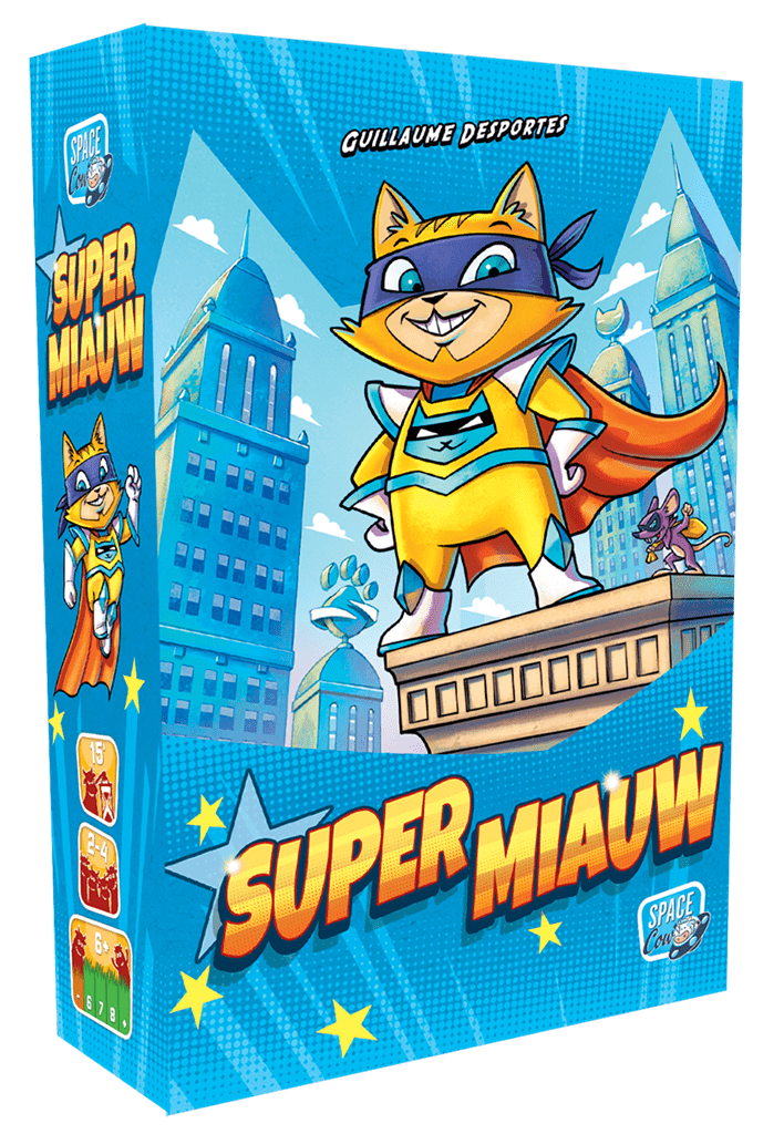 Réussissez à l’attirer en lui offrant sa pâtée préférée et trouvez-lui un costume digne de ses exploits. À partir des mêmes cartes de départ, chaque joueur compose son propre paquet de cartes en les obtenant au marché ou à la banque. Le premier joueur qui arrive à avoir devant lui, lors d’un même tour, une carte Chat et une carte Cape recrute Super Miauw et remporte la partie!