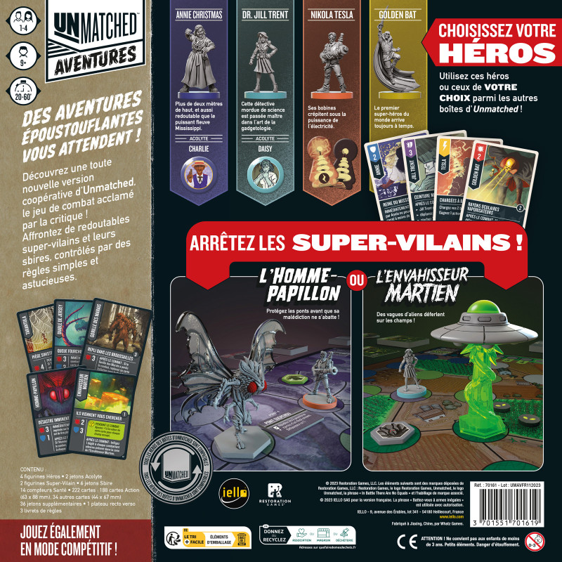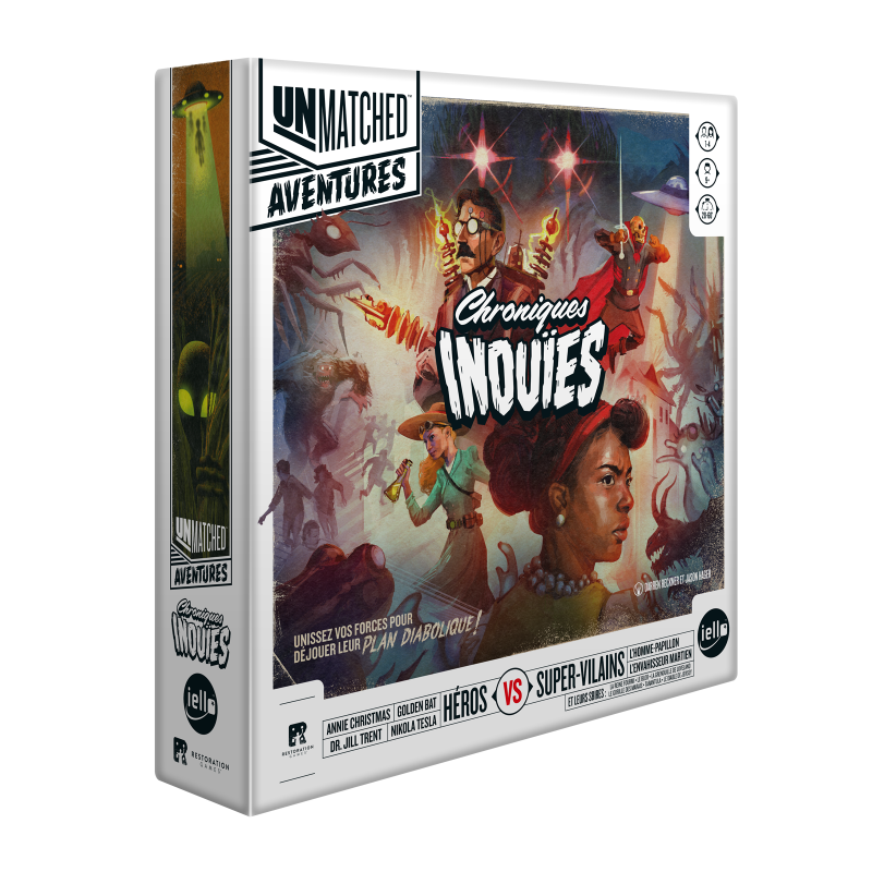 Explorez de nouveaux horizons avec vos héros préférés ou toute autre héroïne issue des ensembles Unmatched. Affrontez les méchants et leurs sbires machiavéliques ! Devrez-vous faire face à Mothman ou à l’envahisseur martien ? Découvrez une toute nouvelle dimension coopérative du jeu de combat Unmatched, un titre unanimement salué par les critiques. Quatre héros, quatre decks, quatre styles ! Unmatched Aventures : Chroniques Inouie est un jeu coopératif qui permet de s’opposer à des créatures emblématiques, chacun ayant son propre style de combat avec ses forces et faiblesses. Cette version vous permet d’incarner Nikola Tesla, le légendaire Golden Bat – le tout premier super-héros, Jill Trent, une scientifique émérite, et Annie Christmas, une femme d’une stature imposante et d’une force équivalente à celle du puissant Mississippi.. Dans cette version, les antagonistes et leurs acolytes sont régis par un ensemble de règles simples et ingénieuses. Parfaitement compatible avec les autres jeux Unmatched, cette édition vous offre également la possibilité de s’affronter ! Vous pourrez également par la suite jouer avec tous les héros des anciennes boites sur le plateau coopératif.
