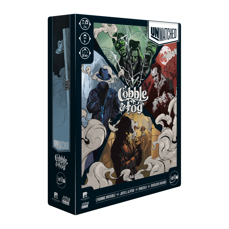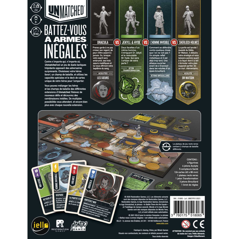 N’importe qui. N’importe où. Unmatched, ce sont des duels tactiques rapides, féroces et asymétriques, champion contre champion. Choisissez votre héros, déterminez un champ de bataille, puis utilisez votre deck et vos capacités spéciales pour l’emporter. Dracula : Prenez garde à ne pas croiser son regard, de peur d’être asservi à jamais. Ou, lorsque votre esprit sera embrumé, ses trois sœurs maléfiques et lui vous offriront votre baptême du sang. Dr Jekyll & Mr Hyde : Deux facettes d’un même homme : l’intriguant Dr Jekyll et le redoutable My Hyde. Qui sera l’artisan de votre perte ? L’Homme Invisible : Comment se défendre contre quelque chose que l’on ne voit pas ? Un simple reflet métallique et il est déjà trop tard. Une attaque surprise avant de s’évanouir dans les volutes d’un épais brouillard. Sherlock Holmes : La partie est lancée ! Assisté du fidèle Dr Watson, il déduira votre stratégie et vous laissera pantois quant à la façon dont il a fait s’écrouler votre plan supposé parfait. En un mot : élémentaire. Jouable de façon indépendante ou bien combiné avec d’autres boîtes d’Unmatched pour des parties jusqu’à 4 joueurs !
